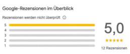 Unsere Google-Bewertungen geben Dir einen ersten Eindruck über unsere Arbeit. Die bisher ausschließlichen Top-Bewertungen unterstreichen die Qualität unserer Dienstleistungen. Darüber hinaus bieten sie wertvolles Feedback, das uns hilft, unsere Angebote weiter auszubauen und auf die Bedürfnisse unserer Kunden einzugehen. In einer digitalen Welt sind Google-Bewertungen ein unverzichtbares Werkzeug.